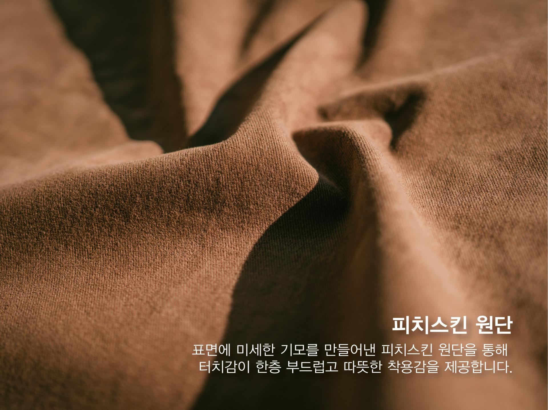 표면에 미세한 기모를 만들어낸 피치스킨(peach skin) 원단으로 따뜻함과 부드러운 착용감을 더했습니다.